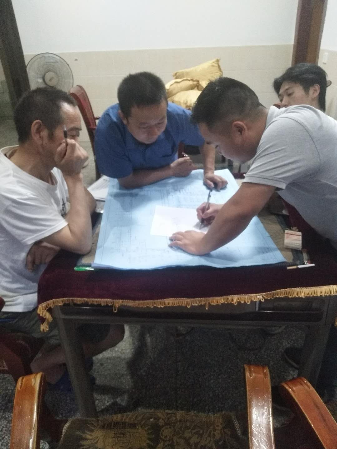 设计部及技术部和项目部在内江项目晚上一起研究方案。